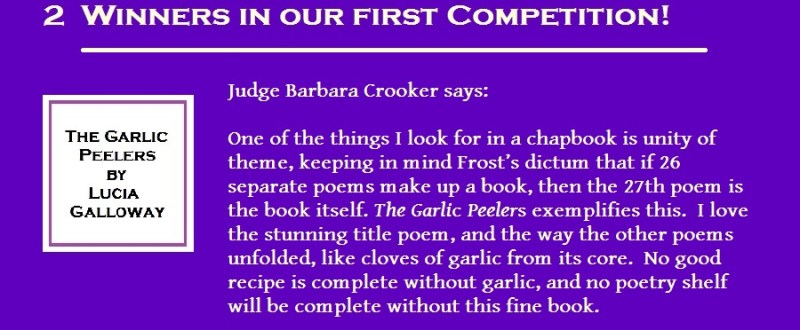 One of the things I look for in a chapbook is unity of theme, keeping in mind Frost’s dictum that if 26 separate poems make up a book, then the 27th poem is the book itself. The Garlic Peelers exemplifies this. I love the stunning title poem, and the way the other poems unfolded, like cloves of garlic from its core. I also admired the variety of forms and voices used, and the central metaphor: women’s lives as many-layered and essential as garlic. I like the way Lucia Galloway plays with multiple levels of meaning (chase/chaste/chastened; skins/scraps/leavings/chaff), the quotes that are salted between sections, and the way each section is introduced by lines that are excerpted and reworked from the title poem. No good recipe is complete without garlic, and no poetry shelf will be complete without this fine book.